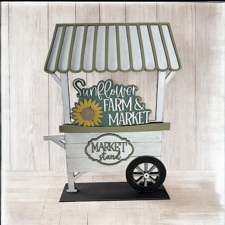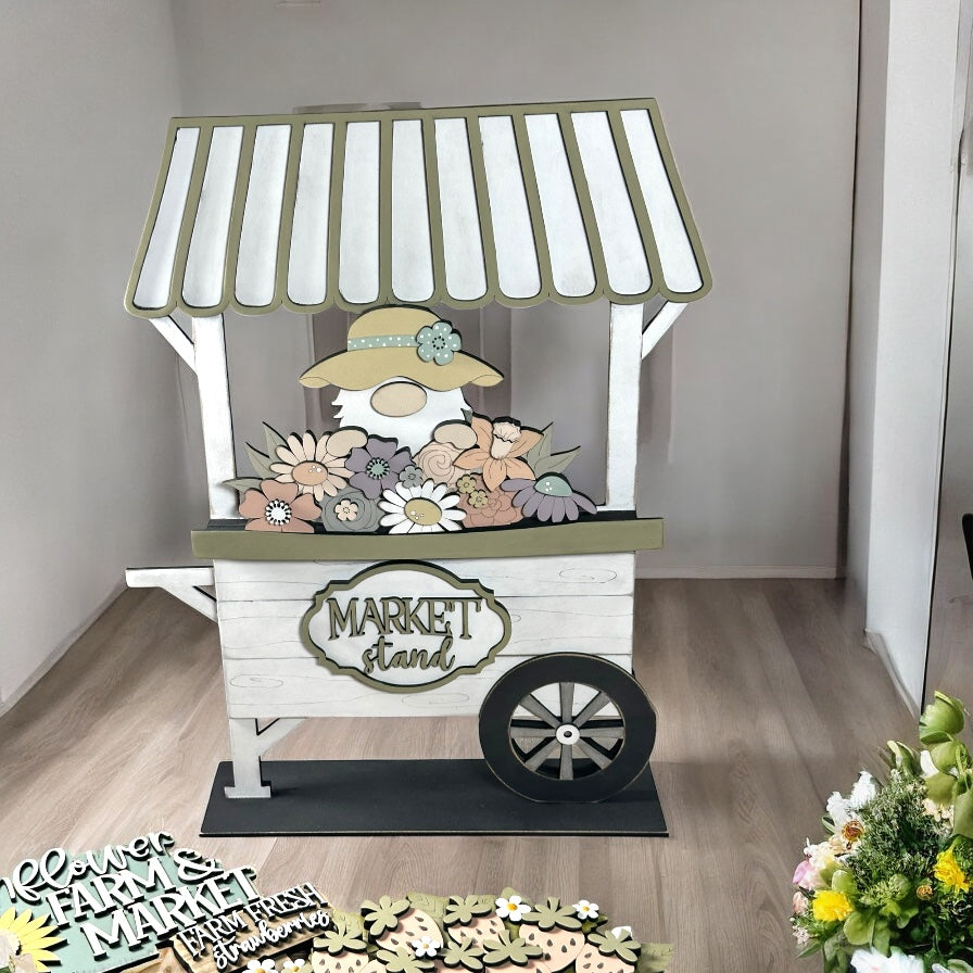 Market stand base for interchangeable flower basket inserts. This market stand is adorable and big! Handpainted in olive green and white. This is part of the interchangeable flower basket collection. All of the change out sets from this collection will fit all of the bases. They are all interchangeable! Mix and match any way you decide!